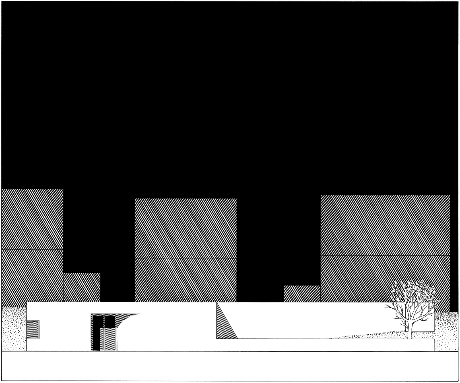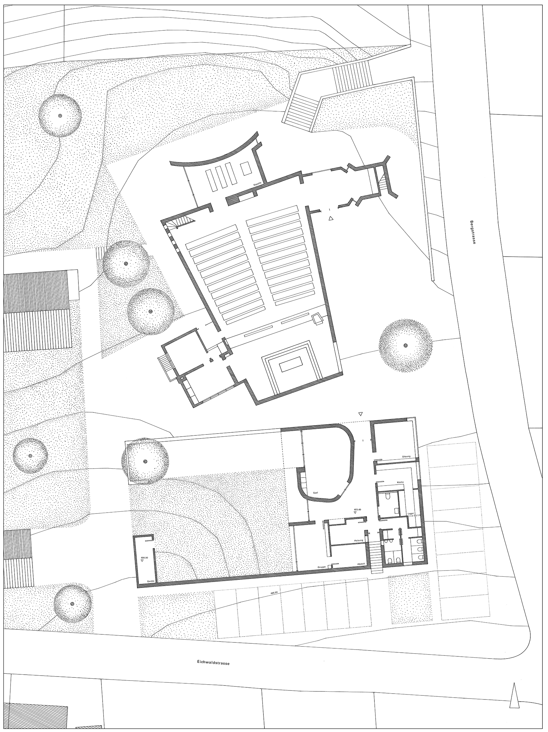 Weiße Mauern umschreiben ein eigenständiges Geviert, in dem das Gemeindehaus und die zugeordneten Freibereiche liegen. Zwischenräume und Zugänge binden die geplante Bebauung in den Bestand ein: So wird der Kirchvorplatz an der dritten Seite nach Süden gefasst. Hier liegt auch der Eingang in das Gemeindehaus gegenüber dem neu geschaffenen Eingang der Kirche. Der Vorplatz wird entsprechend seiner Bedeutung im städtischen Zusammenhang aufgewertet. Zwischen Kirche und Gemeindehaus entsteht eine Gasse, die vom Kirchvorplatz in den rückwärtigen, westlichen Gartenbereich führt. Zum Straßenraum hin bildet die Bebauung eine klare Raumkante. Die Flächen zwischen Mauer und Fahrbahn werden zum Parken genutzt. Der bisherige Eingangsbereich wird erweitert zur Aufnahme der verlegten Kapelle. Die flache, neue Bebauung spricht eine ähnliche Sprache wie die Kirche mit ihren großen weißen Wandflächen. Sie bildet mit der Kirche eine Einheit und schafft mit dem liegenden Baukörper dennoch eine Polarität in der Plastik zum aufstrebenden Körper der Kirche.
