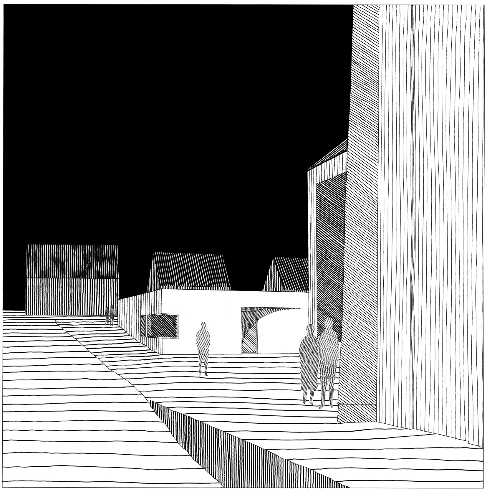 Es gibt nach außen zum Straßenraum wenige Öffnungen in den weißen Wänden des Gemeindehauses. Die Innenräume erschließen sich nicht sofort von außen, sondern wollen erkundet werden. Die einschwingende, einladende Geste des Haupteingangs bekommt ein großes Gewicht. Die gebogene Wand des Gemeindesaals schafft nicht nur markante Innenraumsituationen im Kontrast zum orthogonalen Wandraster, sondern sie weist auch auf die herausgehobene Bedeutung des Saals hin. Vom Eingang führt die gebogene Wand in den Gartenbereich des Gemeindehauses, der nach Süden durch eine Stützmauer geschützt ist und der als Erweiterung und Fortsetzung der Innenräume verstanden wird. Der Gruppenraum und der Saal öffnen sich nach Westen über Glasflächen in diesen Garten. Mit sparsamen Mitteln soll ein markanter Ort für das Gemeindeleben geschaffen werden, der nicht nur „Nutzflächen“ bereit hält, sondern Innen- und Außenräume schafft, die dazu einladen, vielfältig genutzt zu werden und die in ihrer reduzierten Sprache durch Licht, bewegte Zwischenräume und Außenöffnungen wirken und lebendig werden.