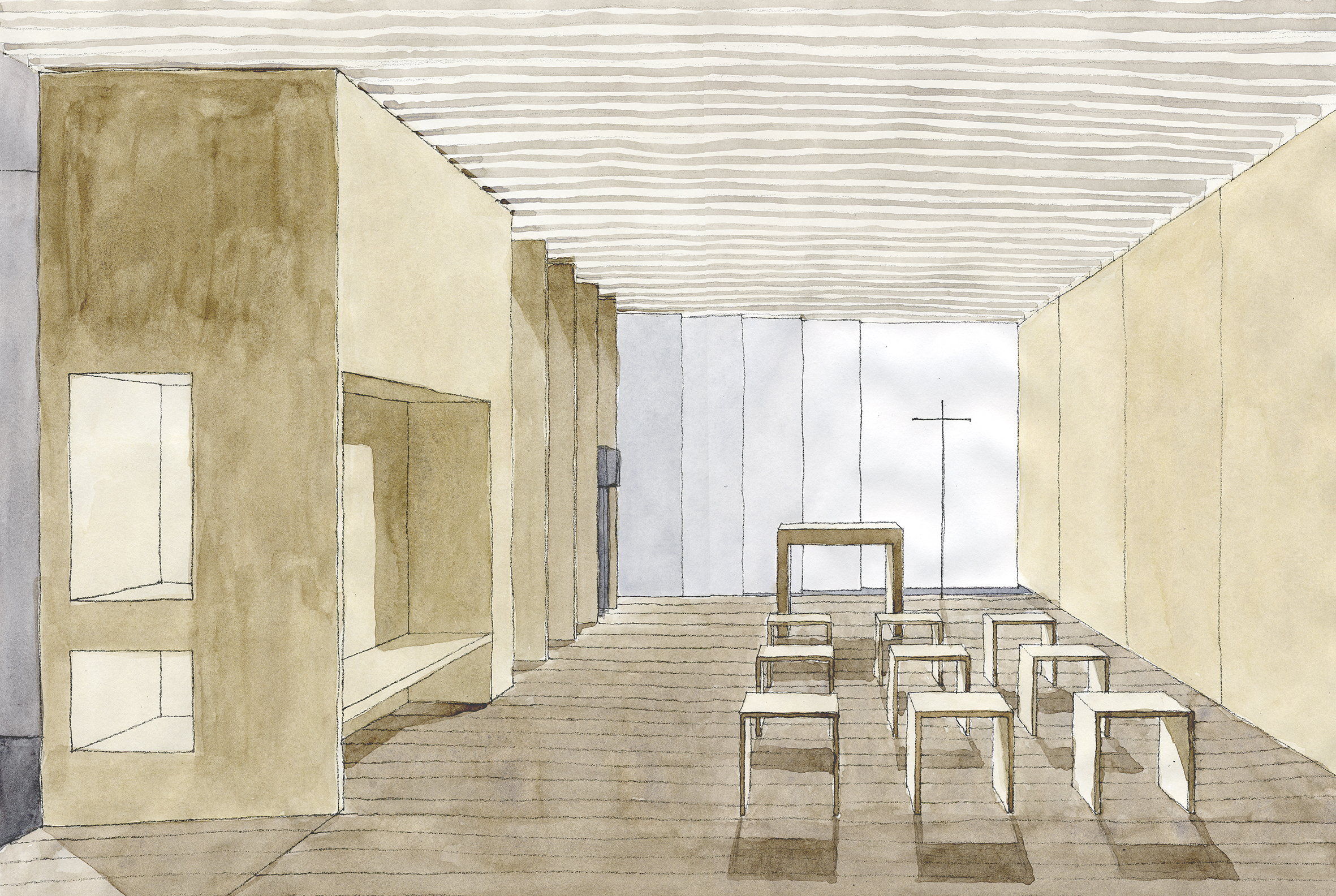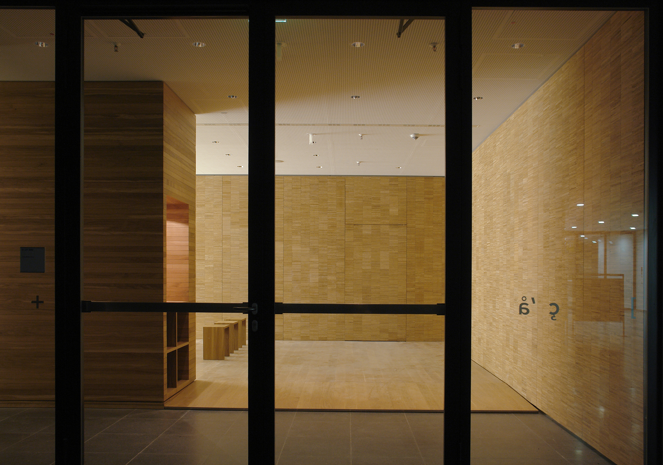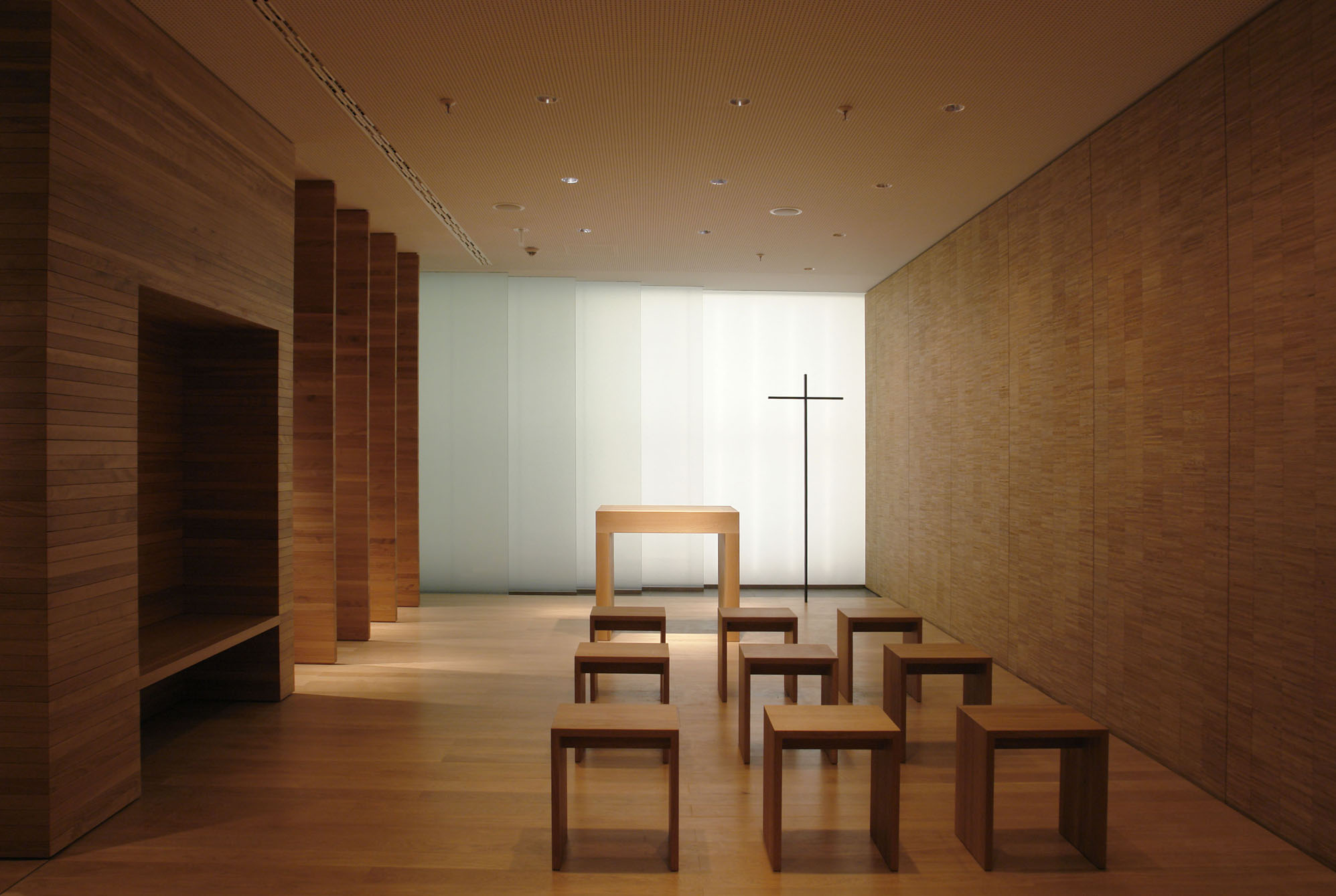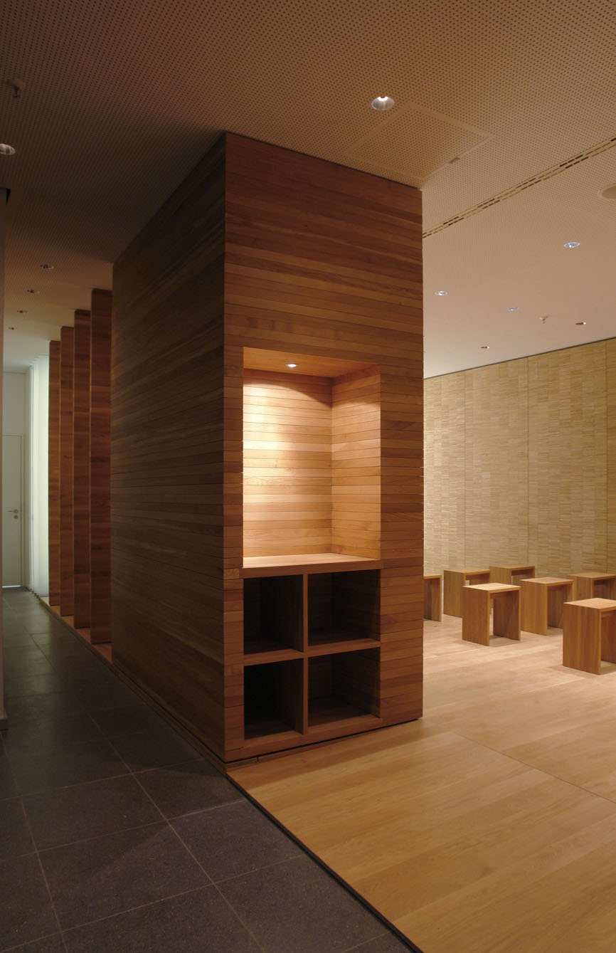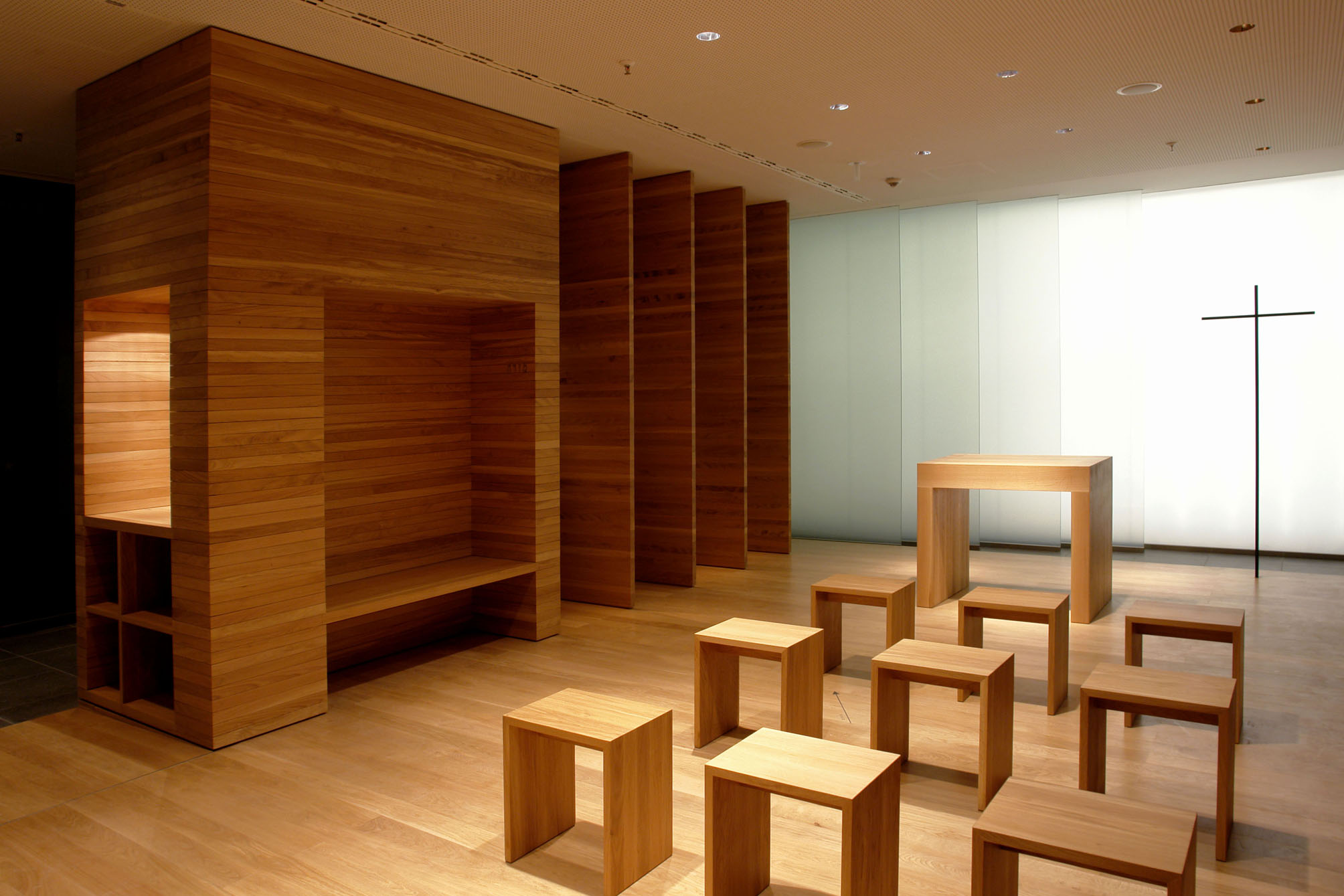 Die Geschäftigkeit der Messe wird ausgeblendet. Die Besucher betreten anderen Grund: Einen Holzdielenboden. Das Licht ist gedämpft. Die Raumbegrenzungen bestehen aus massivem Holz – Eiche. Ein Raum des Gebets und der Andacht braucht in seiner Gestalt „Wahrhaftigkeit“.