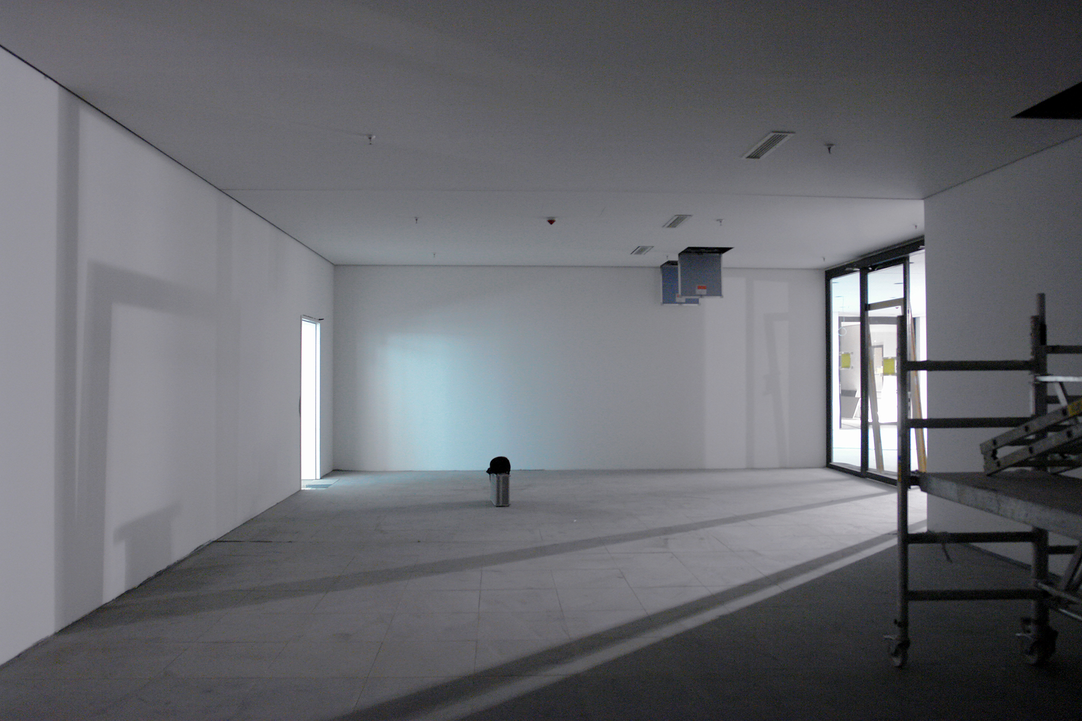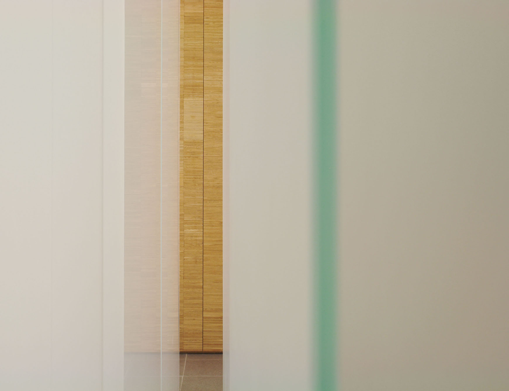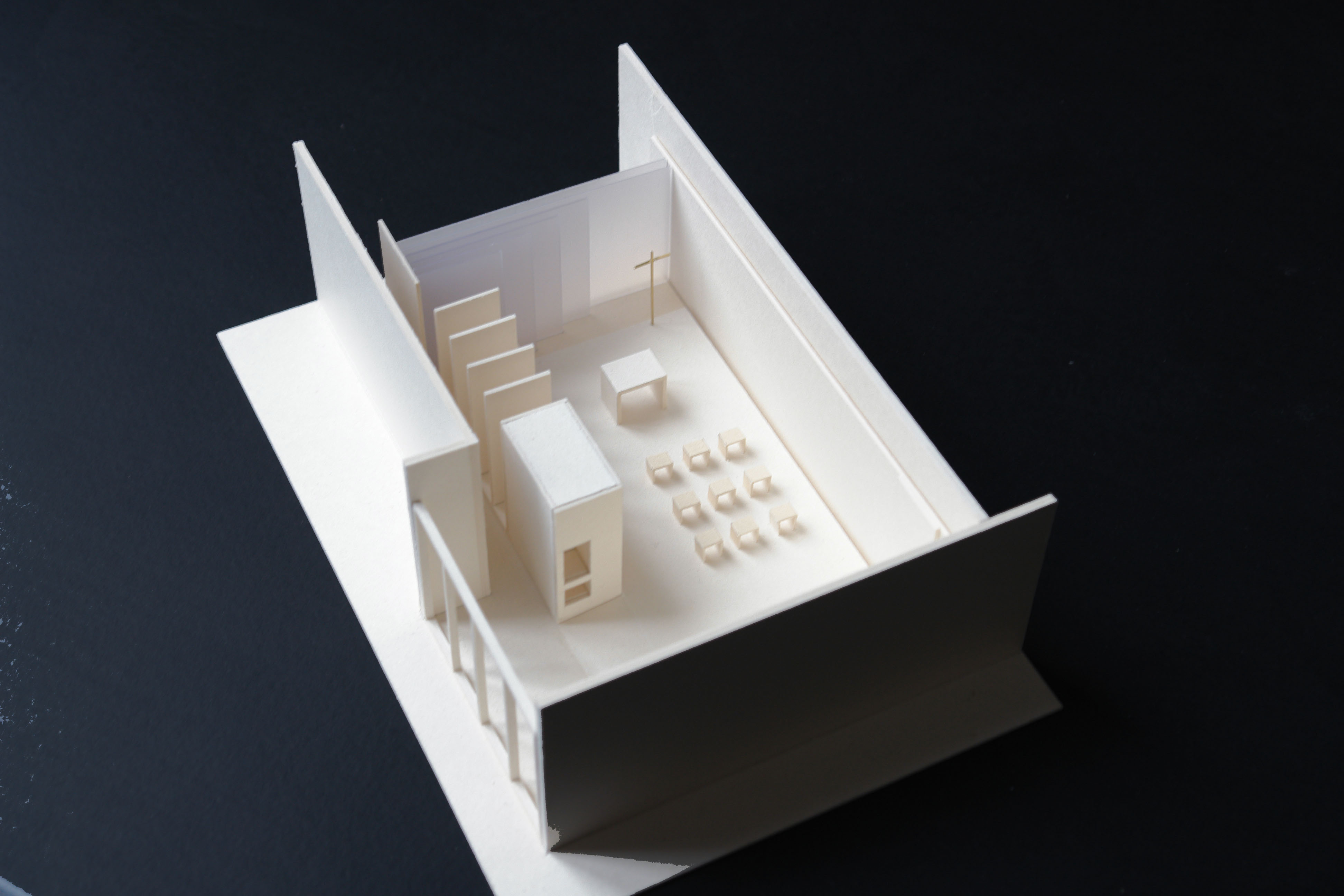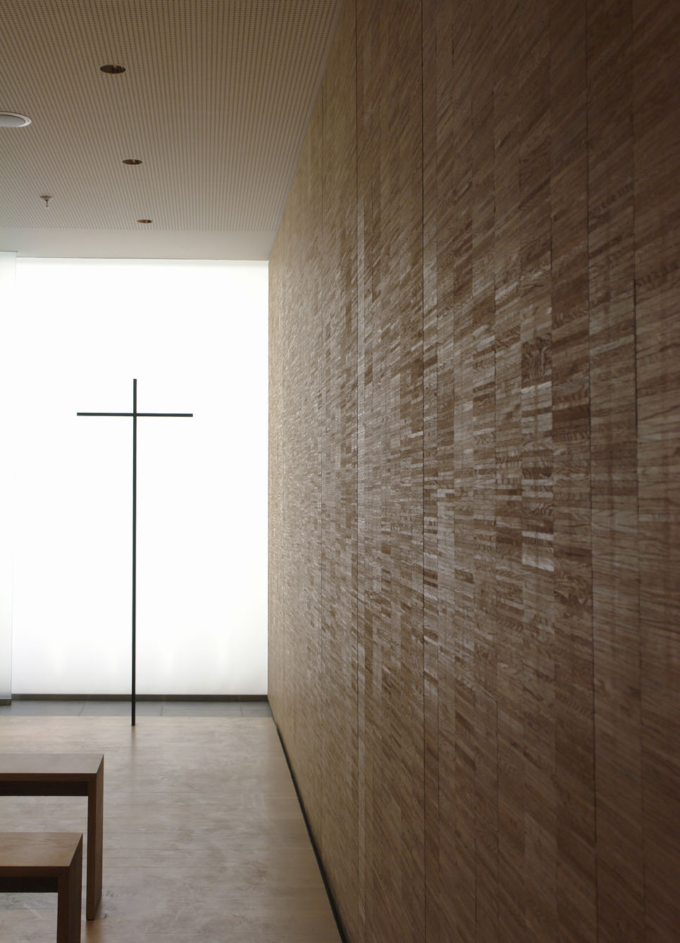 Am wichtigsten ist in einem Raum der Andacht vielleicht das Licht. Erst wenn man den Raum betritt, sieht man die hinterleuchteten Glasscheiben, die sich gestaffelt wie Vorhänge in einen Licht-Raum öffnen. Dort wo das Licht am hellsten ist, steht das Kreuz, aus dunklem Stahl gefertigt. Licht verweist hier auf das Jenseitige, das Grenzüberschreitende.
