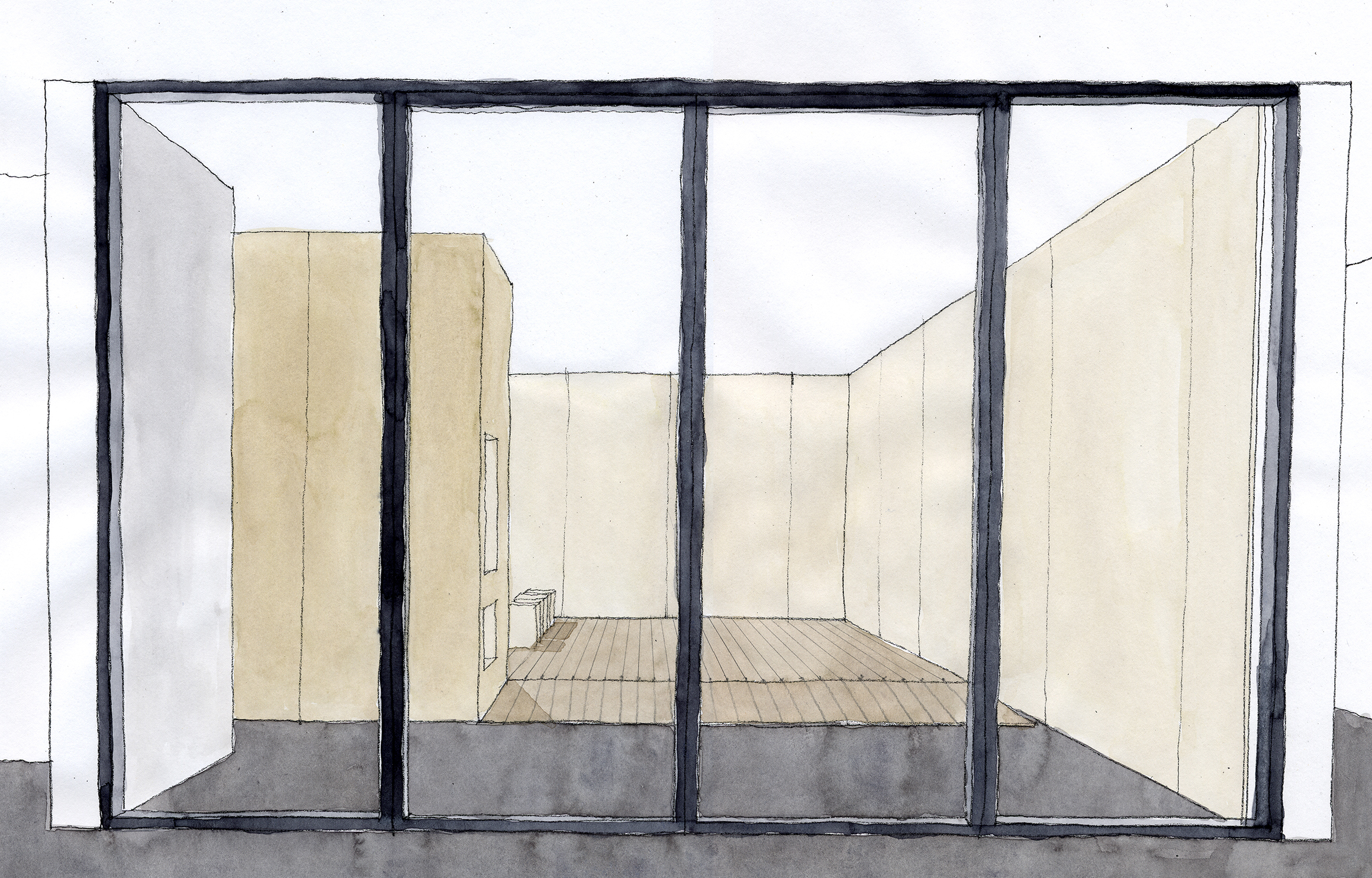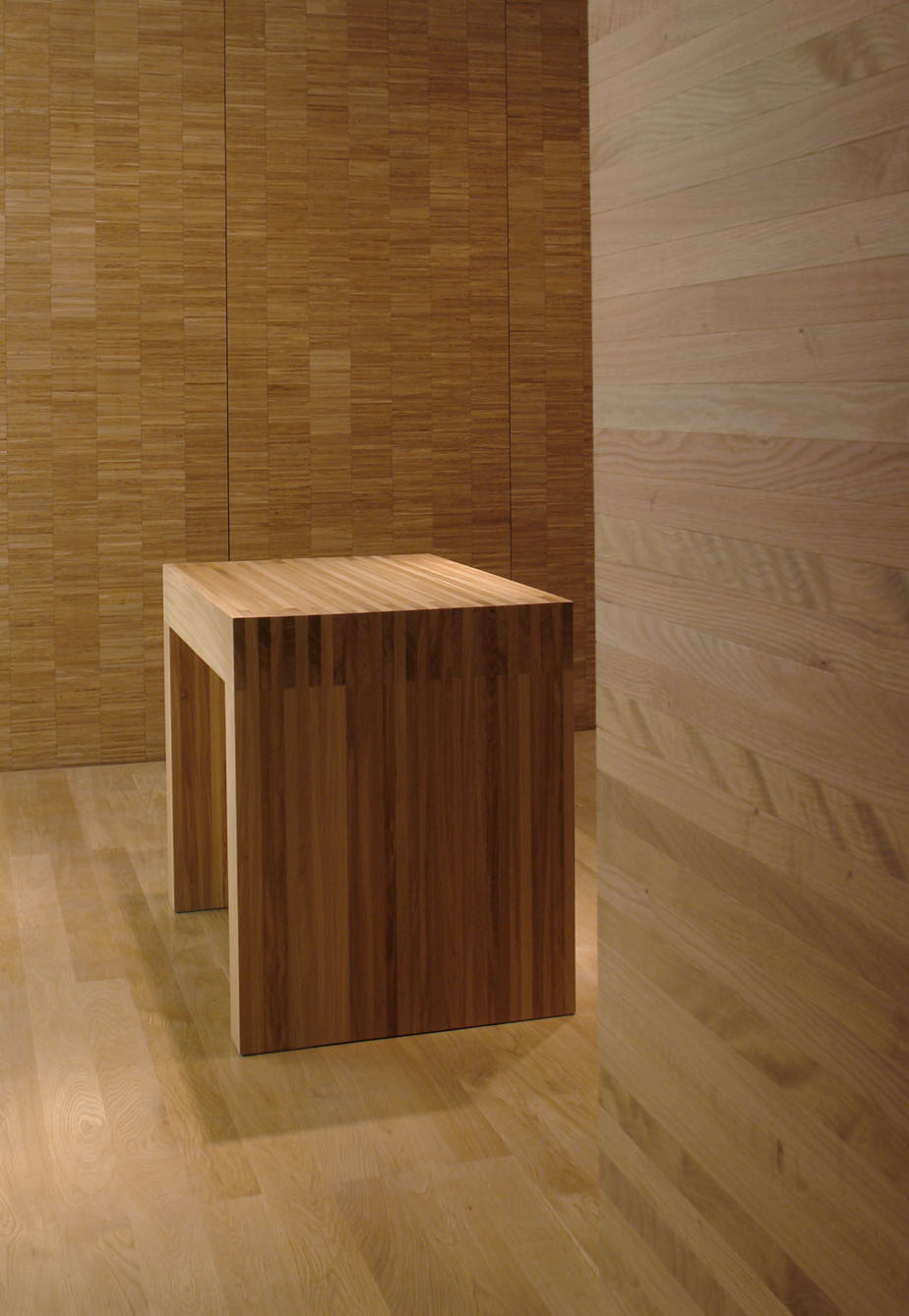 Die Materialien sind nicht nur visuelle Dekoration, sondern das massive Holz kann angefasst und mit allen Sinnen wahrgenommen werden. Einfache Sitzhocker und eine eingebaute Sitzbank laden ein zum Verweilen.