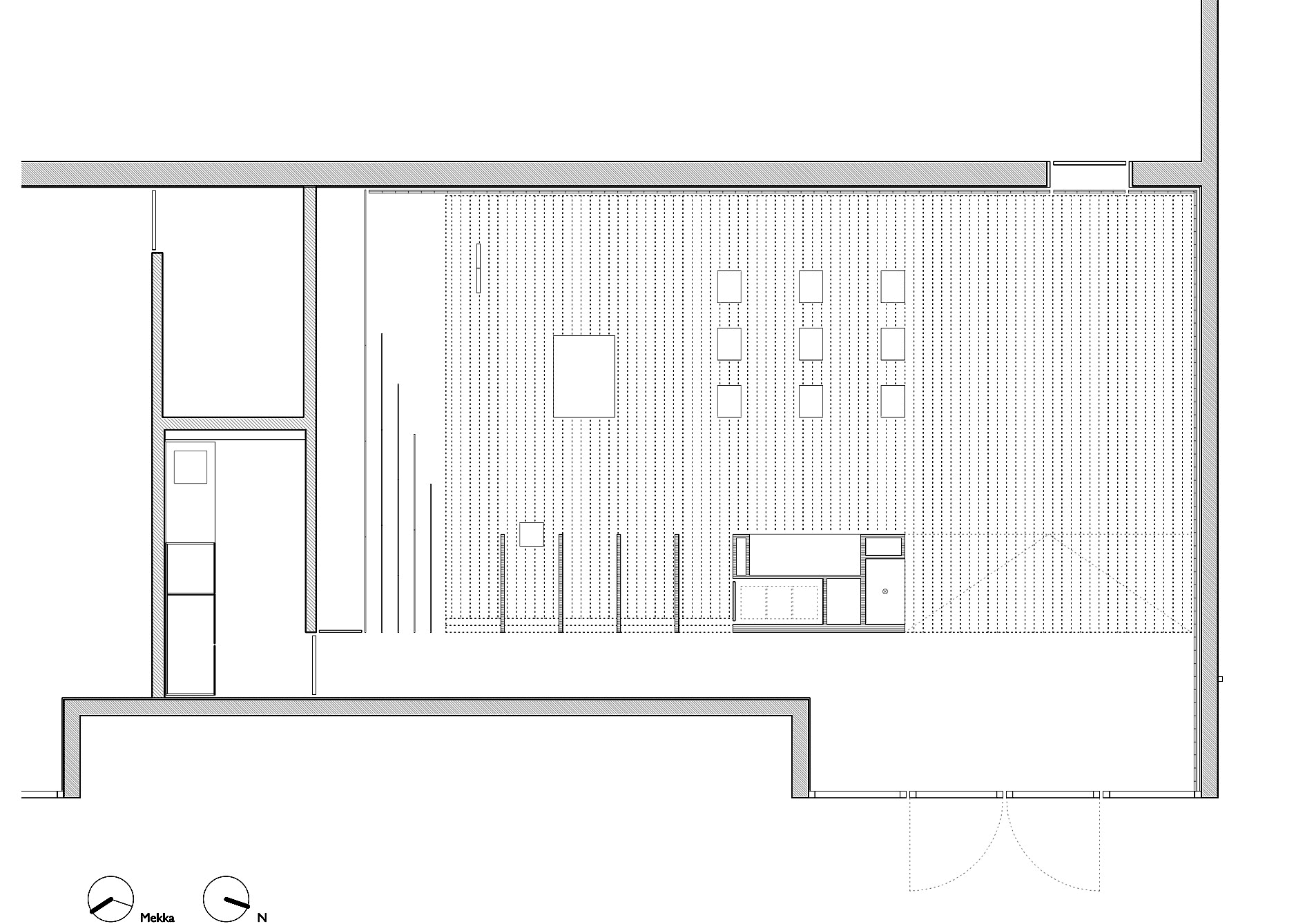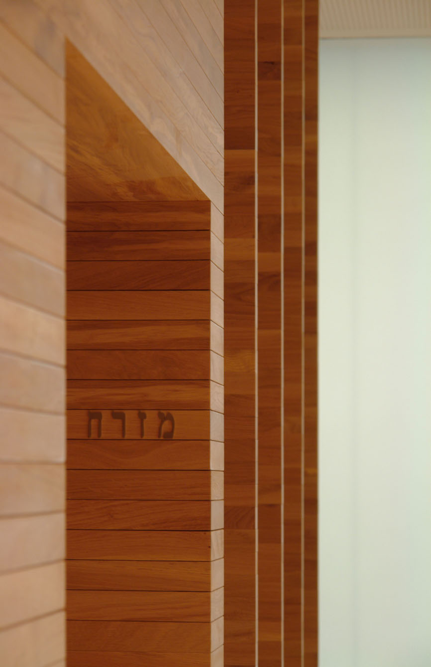 Der Altartisch besteht aus massivem, geleimten Eichenholz. Das große Kubuselement am Eingang schirmt den Andachtsbereich von der vorhandenen Glastür ab und nimmt Fächer für Schriften und Gebetsteppiche auf. Holzschotten aus Eichenstäben in der Fortsetzung schirmen den Zugang zur Sakristei als zweite Raumschicht ab.