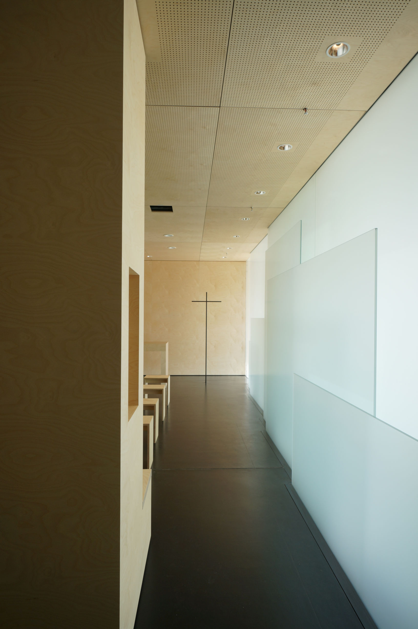 Der Andachtsraum wird vom Flur aus über eine verglaste Tür betreten, durch die bereits eine gestaltete Glaswand gegenüberliegend sichtbar ist. Nach dem Eintritt gelangt man in einen Vorbereich, der durch ein raumhohes Kubuselement mit Ablagefläche abgeschirmt wird. Der Vorbereich erhält gedämpftes Tageslicht über die Glaswand, die durch geschichtete, satinierte Glasflächen unterschiedlichen Formats gestaltet ist. Die Glaswand leitet die Besucher in den eigentlichen Andachtsbereich. Zum Altarbereich hin nehmen die Glasschichten ab, das Licht wird heller. Auch nach oben öffnet sich das Glas. Die Bewegung des Lichts bestimmt die Raumgestalt. Die Außenbereiche werden ausgeblendet.