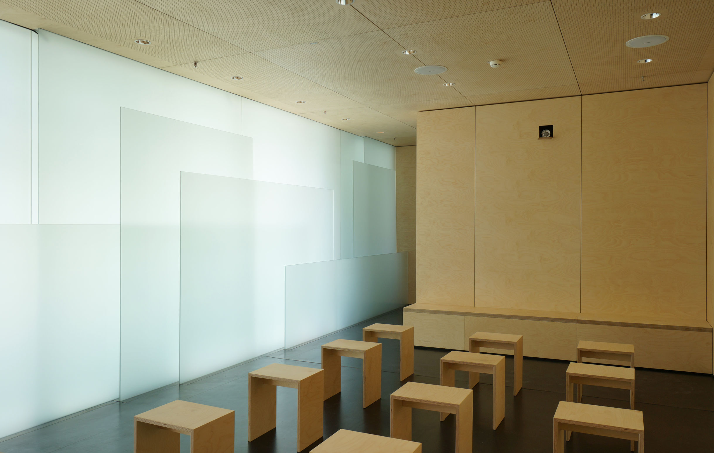 Die Wandflächen sind in ihrer Gestalt zurückgenommen und mit hellen Birken-Multiplexplatten verkleidet. Das Kubuselement ist aus dem gleichen Material konstruiert. Es bietet den Besuchern rückwärtig im Raum eine Sitzbank an. Der Boden ist mit schwarzem Linoleum belegt, der im Kontrast die Holzflächen leuchten lässt, eine Atmosphäre der Geborgenheit vermittelt und auch das Licht, das durch die Glasflächen über den Boden streift, in besonderer Weise sichtbar macht.