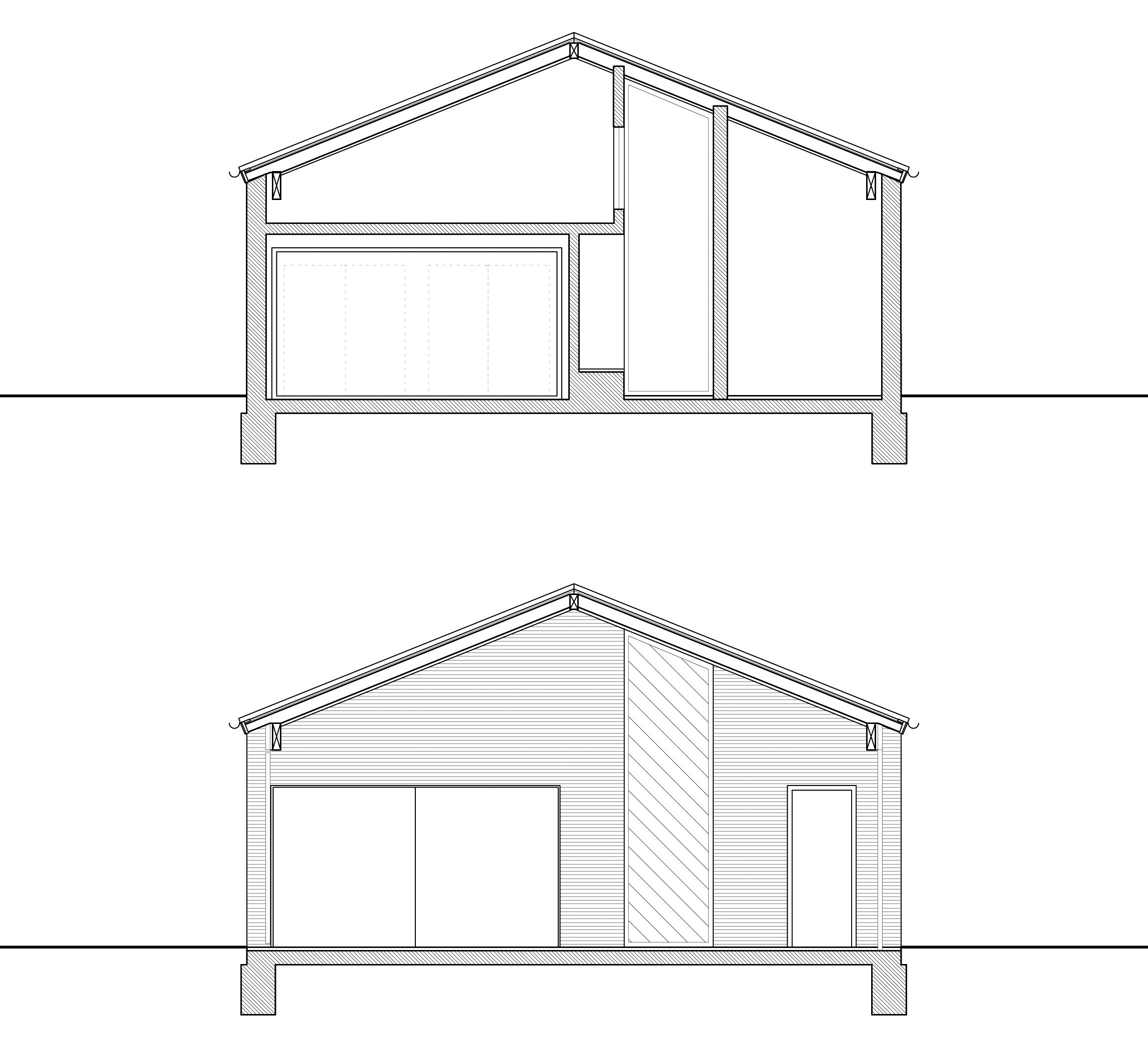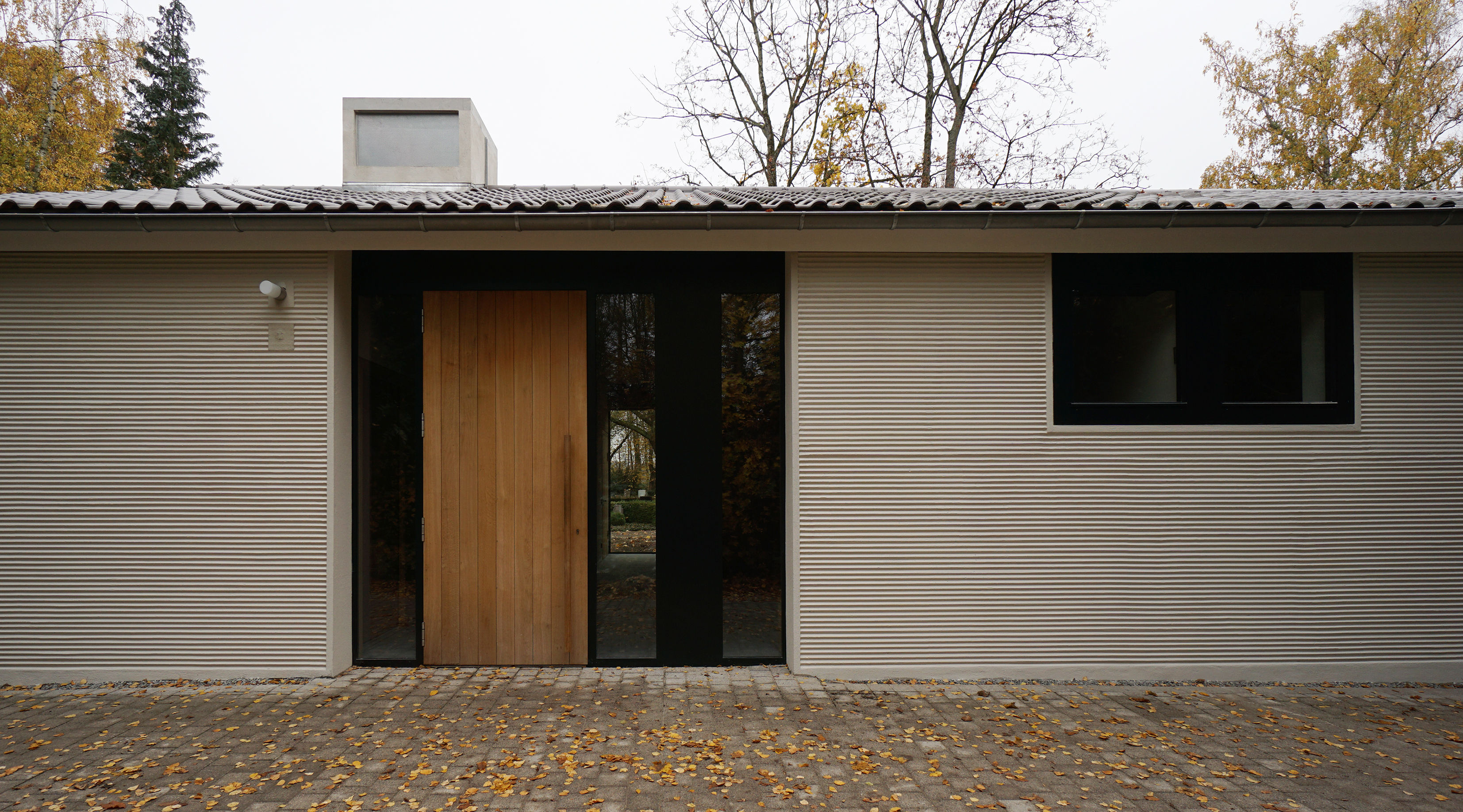 Der Satteldachkörper wurde nach Süden verlängert, genau im bisherigen Gebäudeprofil. Die Werksteindeckung des Satteldachs konnte mit dem gleichen Material weitergeführt werden. Der beigefarbene Klinker ist in der changierenden Färbung nicht mehr erhältlich. Die Ergänzung wurde mit einem Rillenputz ausgeführt, der die Richtung der horizontalen Struktur des Klinkermauerwerks aufnimmt und weiterführt.