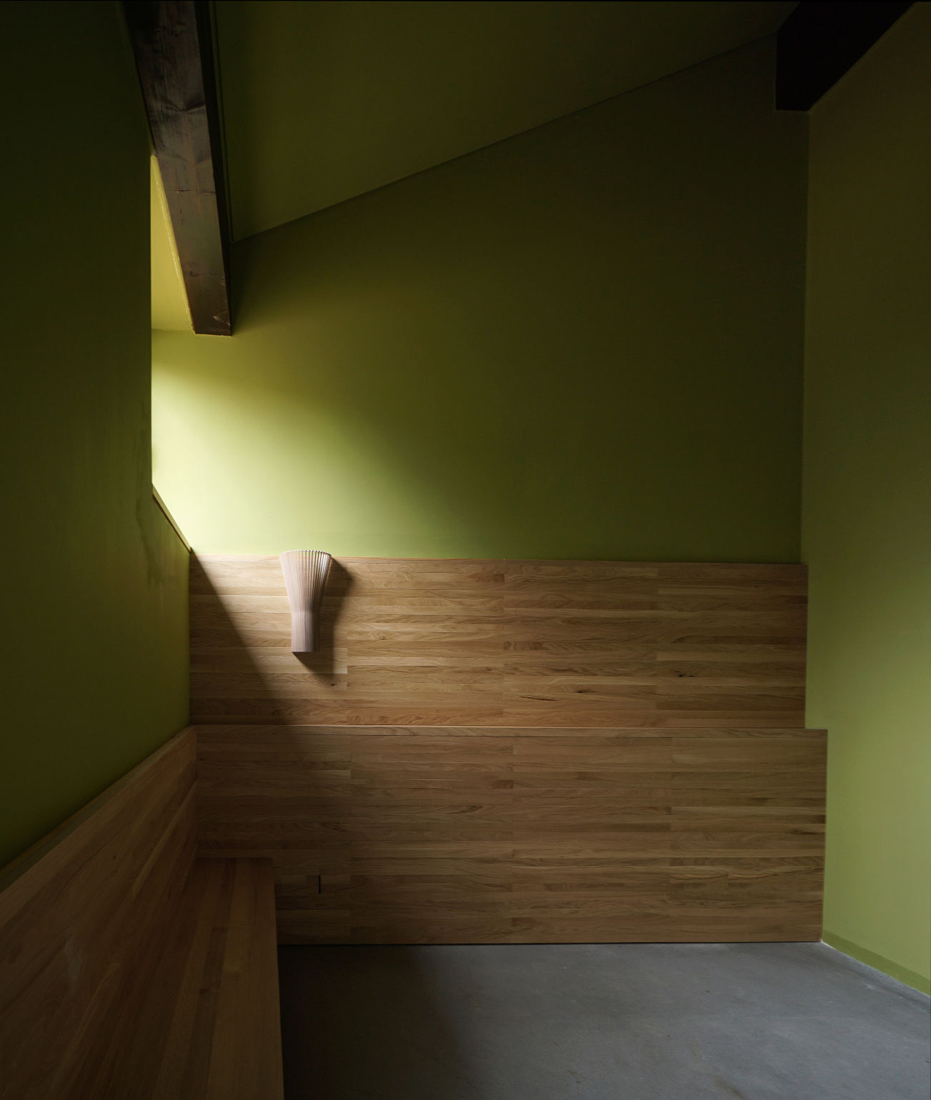 In den Abschiedsräumen sind die neuen Fensteröffnungen so angeordnet, dass trotz der Öffnung nach außen die Intimität gewahrt bleibt. Die im Bereich der Aufbahrung mit Eichenholz bekleideten Wandflächen sind darüber in einem gedeckten Grünton gestrichen, um auch im Inneren eine ruhige, intime Atmosphäre des Abschieds zu erreichen.