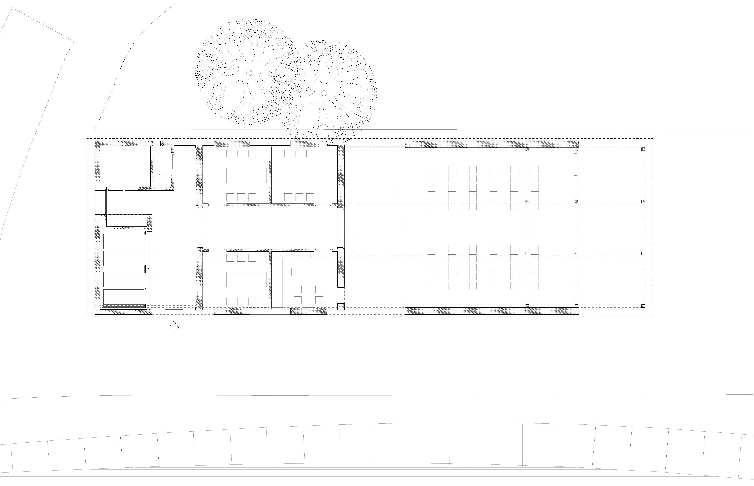 Im Inneren wurden an der Stelle der bisherigen Räume ein Sakristeiraum und drei geschlossene Abschiedsräume eingebaut. Die Ergänzung beinhaltet einen neuen Zugangsbereich mit Eingang von Osten gegenüber der Alb, einen vergrößerten Kühlbereich für die Särge sowie ein kleines WC und einen Technik- und Lagerraum. Die ergänzten Räume sind im Innenbereich als Volumen so angeordnet, dass sich die Zwischenräume nach Westen und nach Süden öffnen und trotz der kompakten Grundfläche eine differenzierte Eingangs- und Aufenthaltszone ergeben.