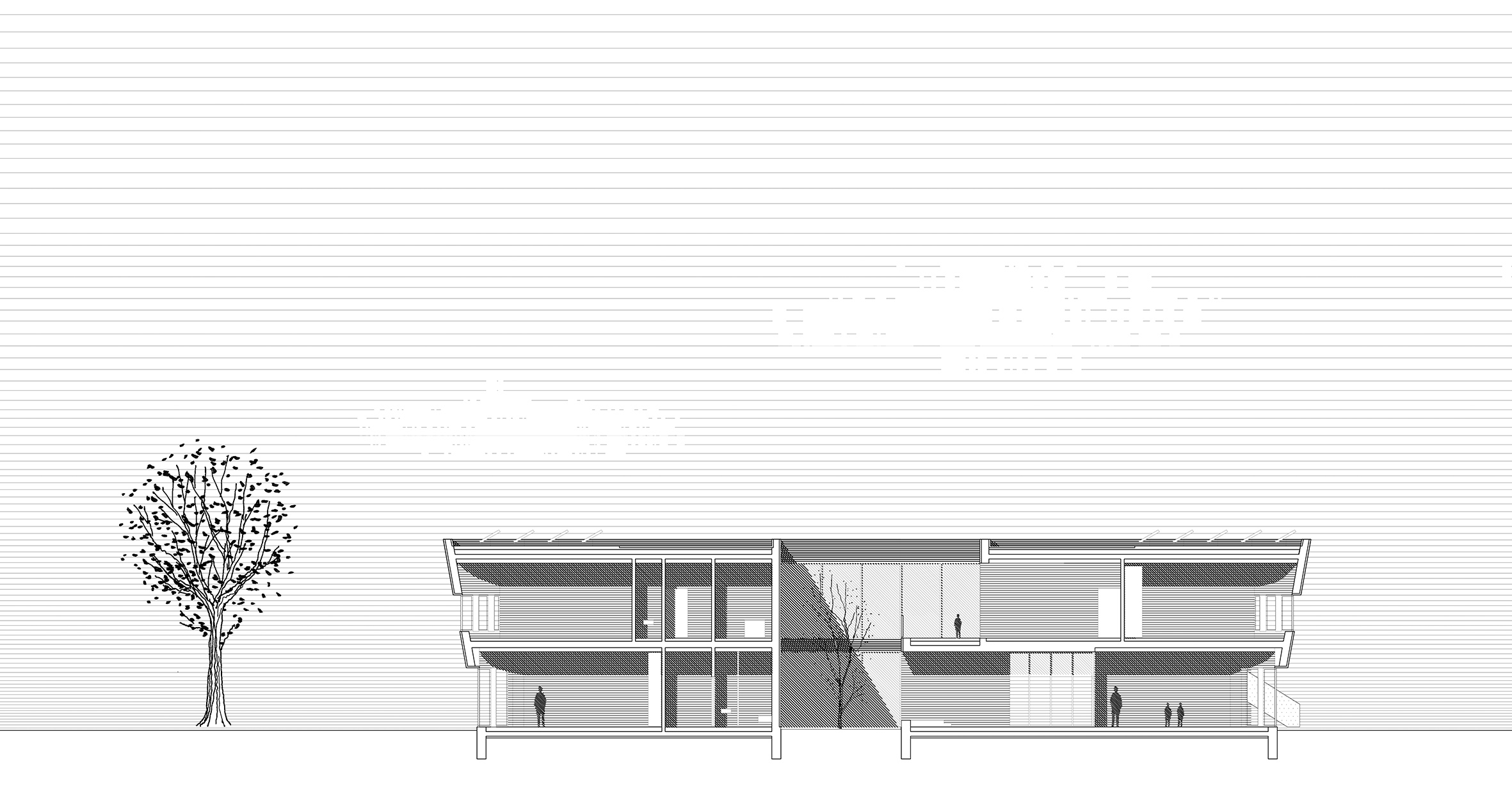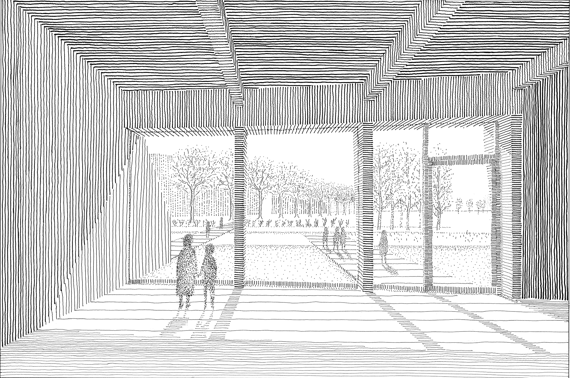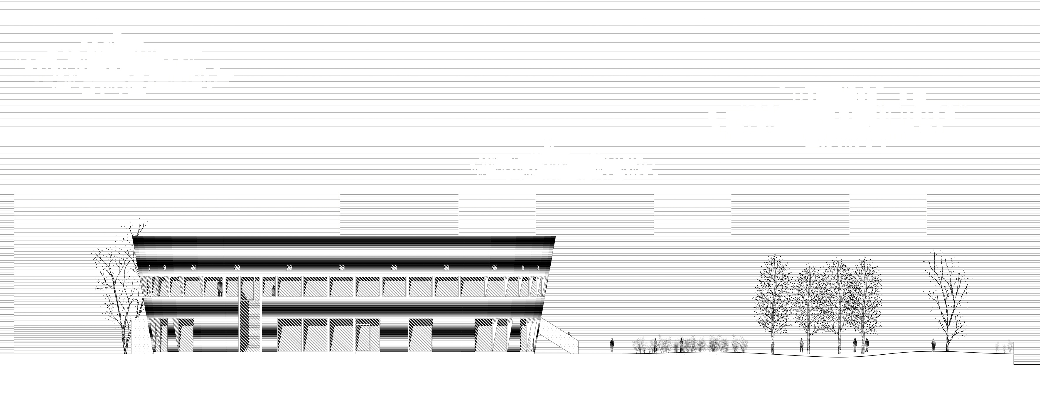 Die innere Struktur und Gebäudekonstruktion ist auf einem orthogonalen Raumsystem aufgebaut und ebenfalls in Holzbauweise geplant. Die inneren Raumachsen stoßen durch die Hülle und laufen weiter in die Freiflächen, gliedern diese und bilden den wichtigen Bezug der Innenräume nach außen.