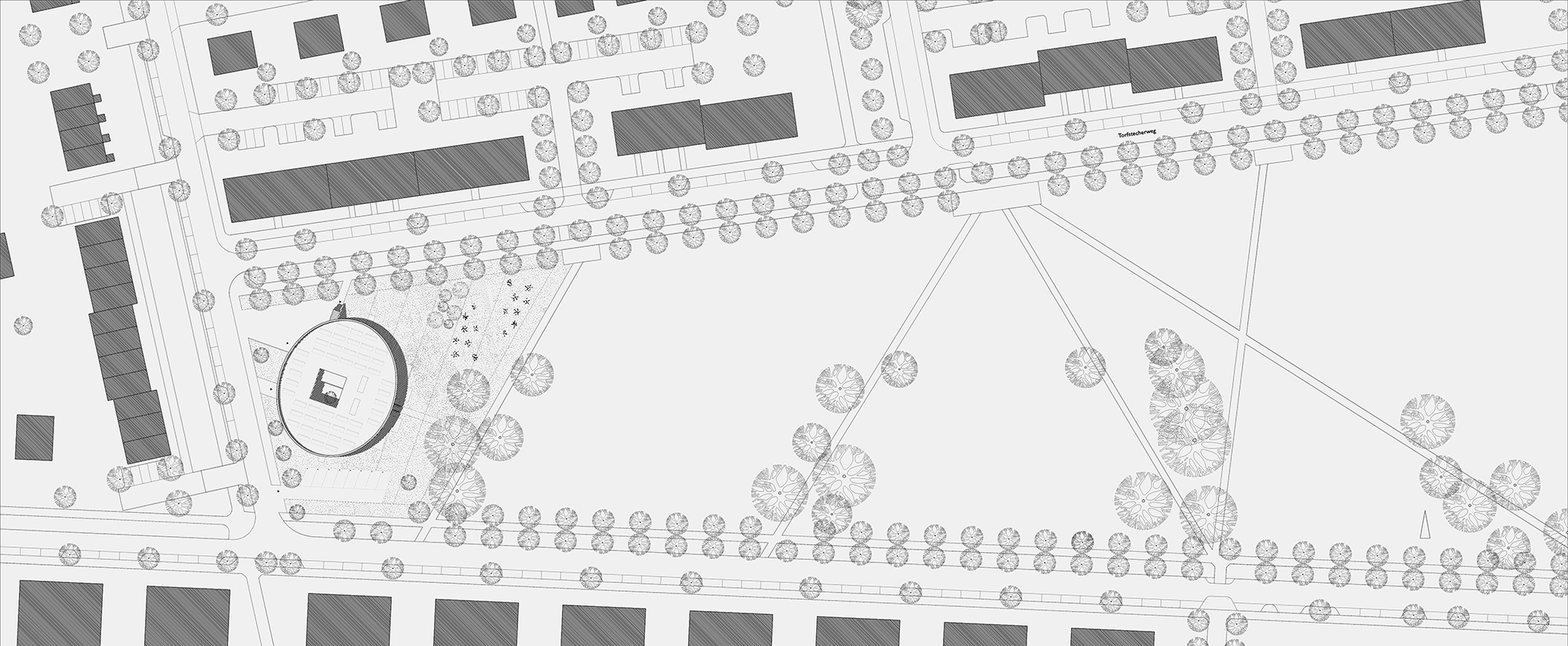 Die Kita wird als Solitär ausgebildet, der auf dem Grundstück am westlichen Ende der Parkspange plaziert wird und gar nicht erst versucht, die flankierenden Straßenräume baulich zu fassen. Vielmehr wird der solitäre Charakter durch die elliptische Baukörperform betont, ihre kompakte Bauweise bewahrt den größtmöglichen Teil der Freiflächen auf dem Grundstück. Der von einer gekrümmten Außenhaut aus Holz umschlossene Baukörper erinnert an eine Arche, die in der Natur steht und den Kindern Lebensraum bietet. Eine besondere Bedeutung haben die Öffnungen, die aus dem bergenden Innenraum heraus den wichtigen Kontakt zur Außenwelt darstellen.
