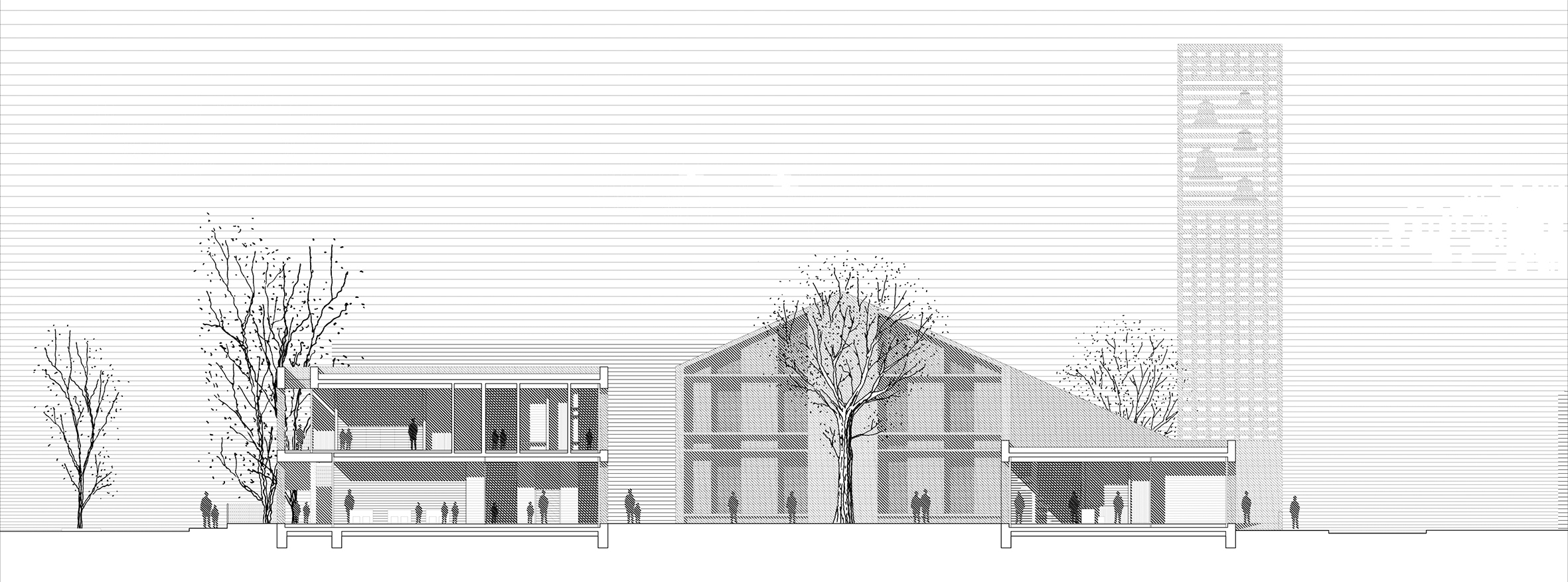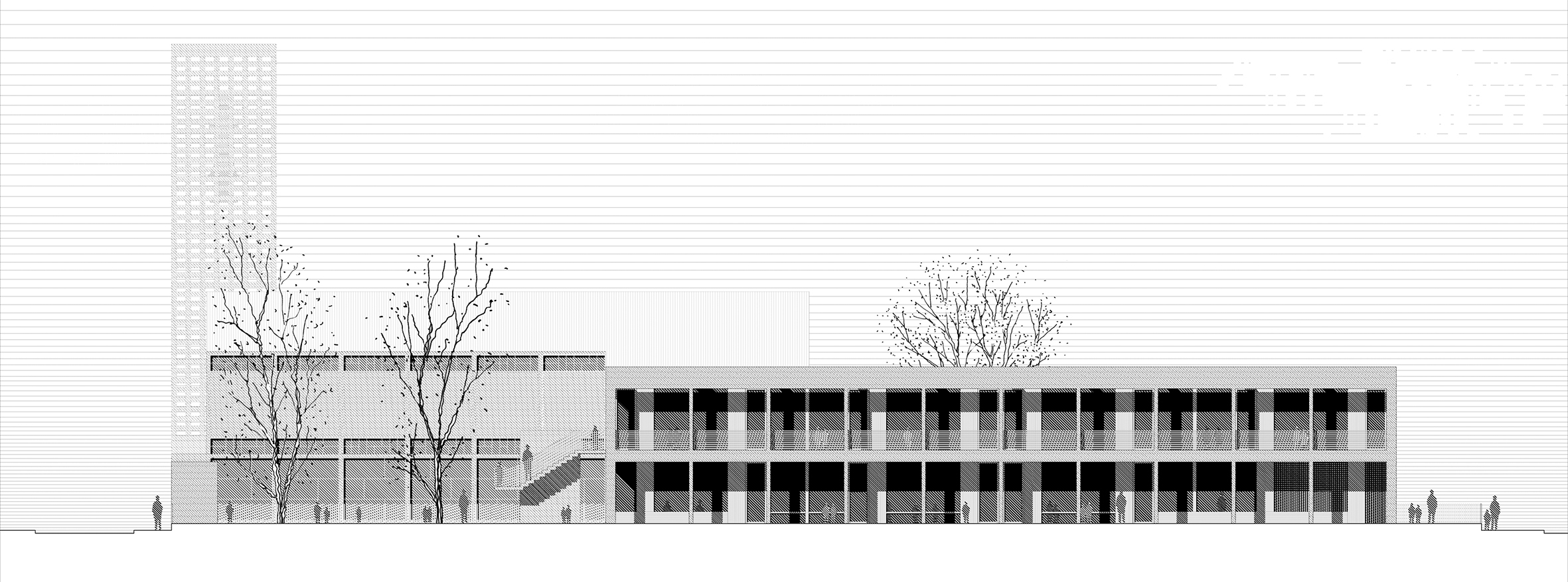 Die neue Bebauung übernimmt Konstruktionselemente, die die Gestalt der Kirche bilden. In der Gestalt wird das Bestehende weitergebaut, während offene und interne Erschließungsbereiche eine neue räumliche Qualität für das gesamte Quartier schaffen. Die neue Bebauung bezieht sich auf den Baukörper der Kirche und ergänzt ihn zu einer neuen stadträumlichen Figur.