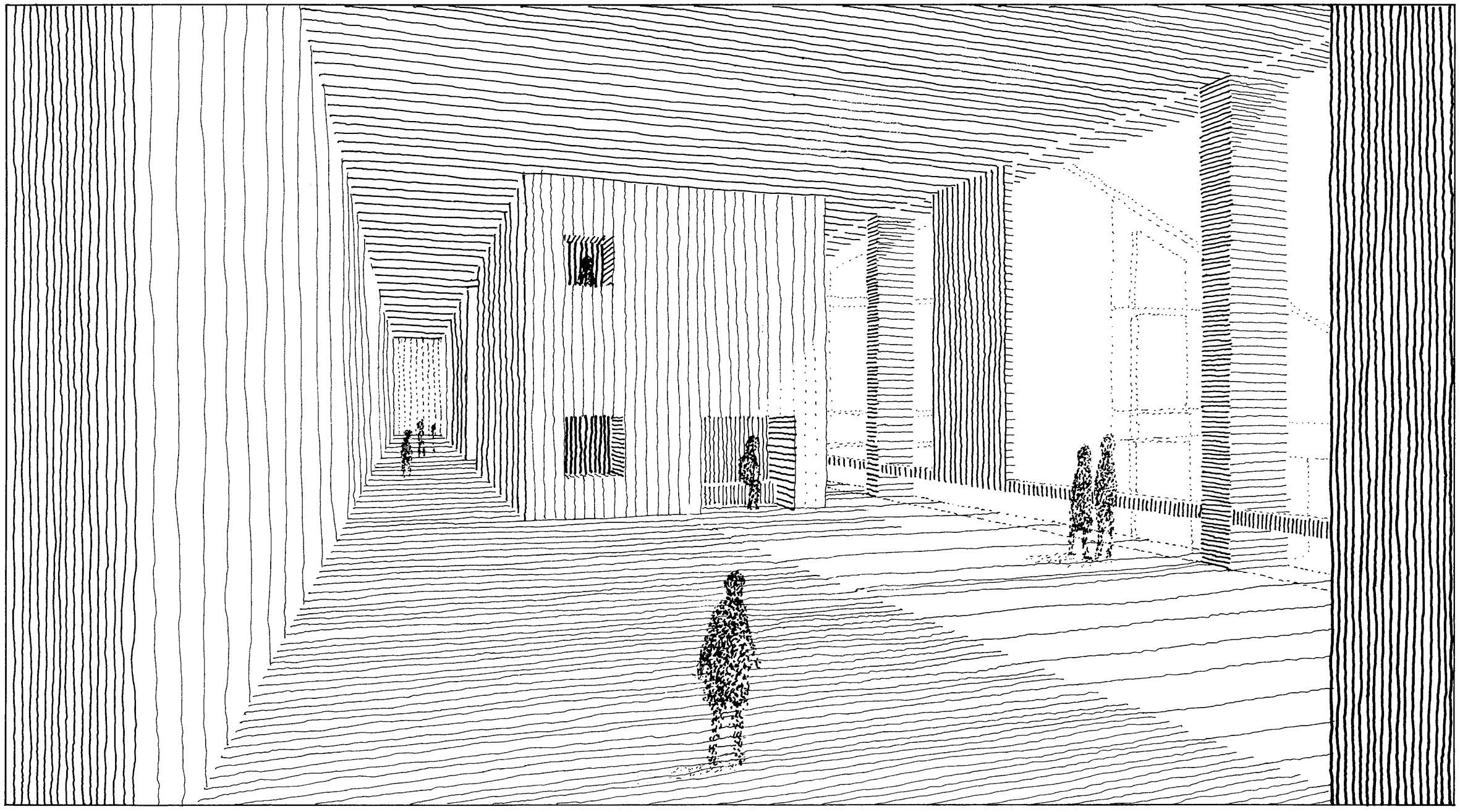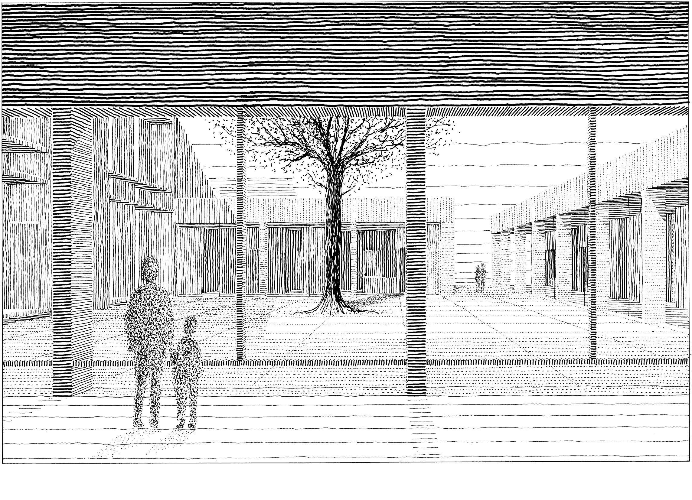 Es entsteht ein offener Freibereich, der als neue Mitte eine geschützte Zugangssituation für alle Nutzungen schafft und gleichzeitig Kommunikationsraum werden kann. Die Zugangswege und die Platzfläche werden durch die drei Baukörper flankiert.
