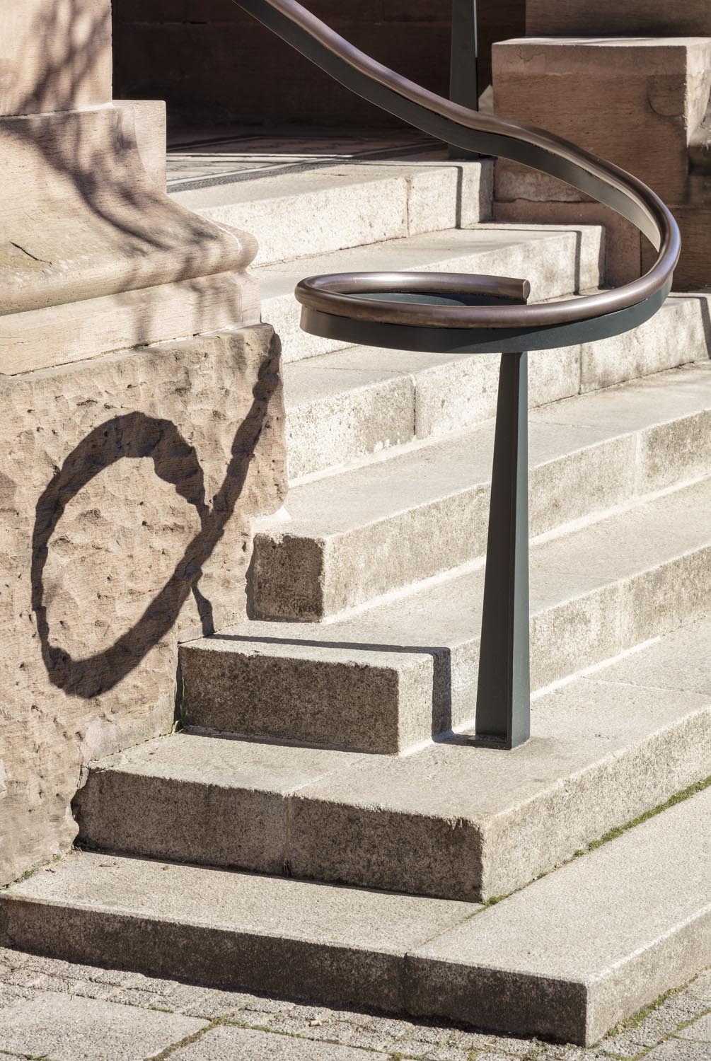 Die Eingangstreppe hat zwei Handläufe benötigt, die mit einer geschwungenen Ausbildung jeweils so ergänzt wurden, dass die Bewegungsabläufe an der Eingangstreppe am Bürgersteig nachvollzogen werden können. Die Ausgangsgestalt des ehemaligen Rathausgebäudes im historistischen Stil mit Jugendstilelementen sollte angemessen ergänzt werden.