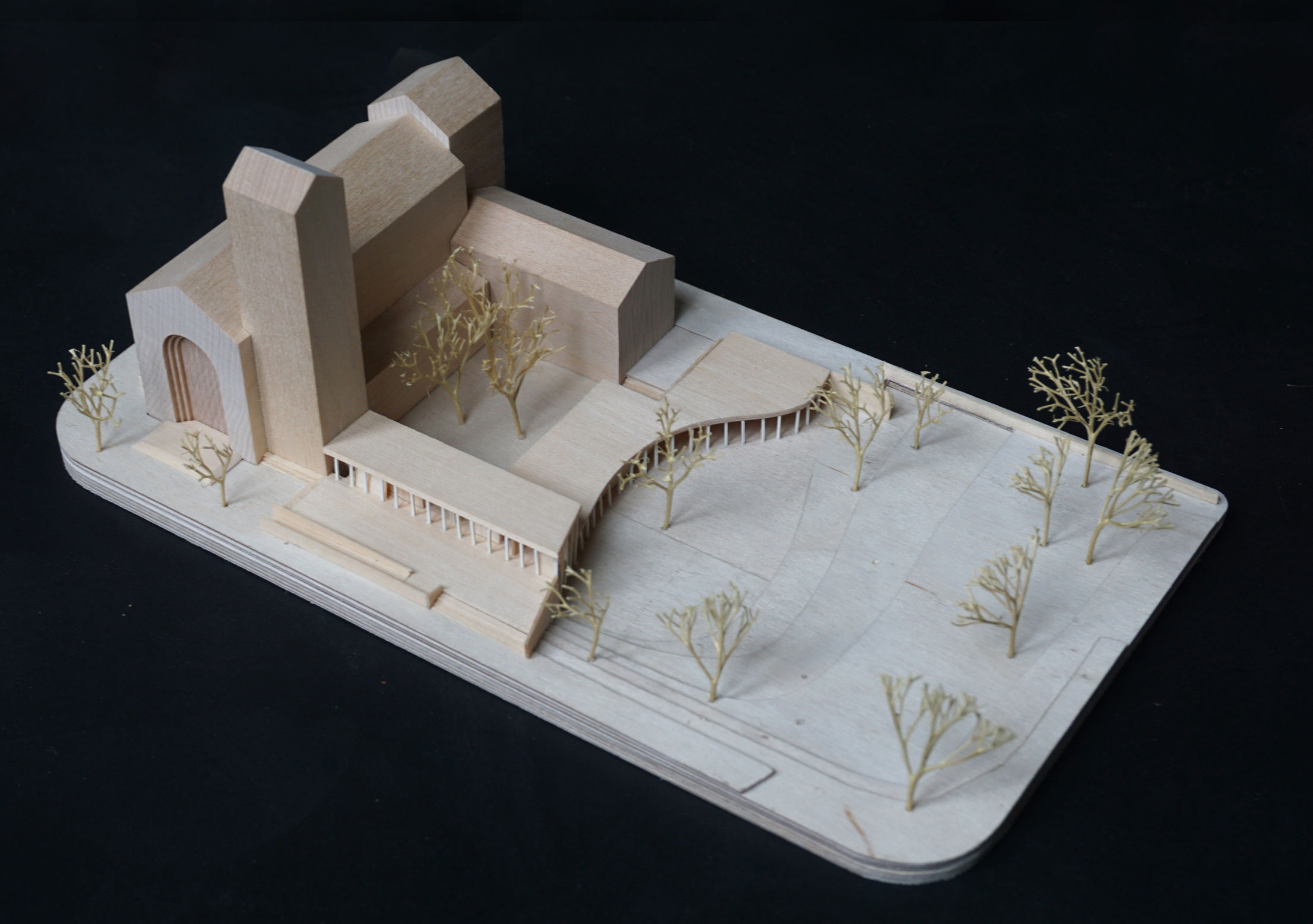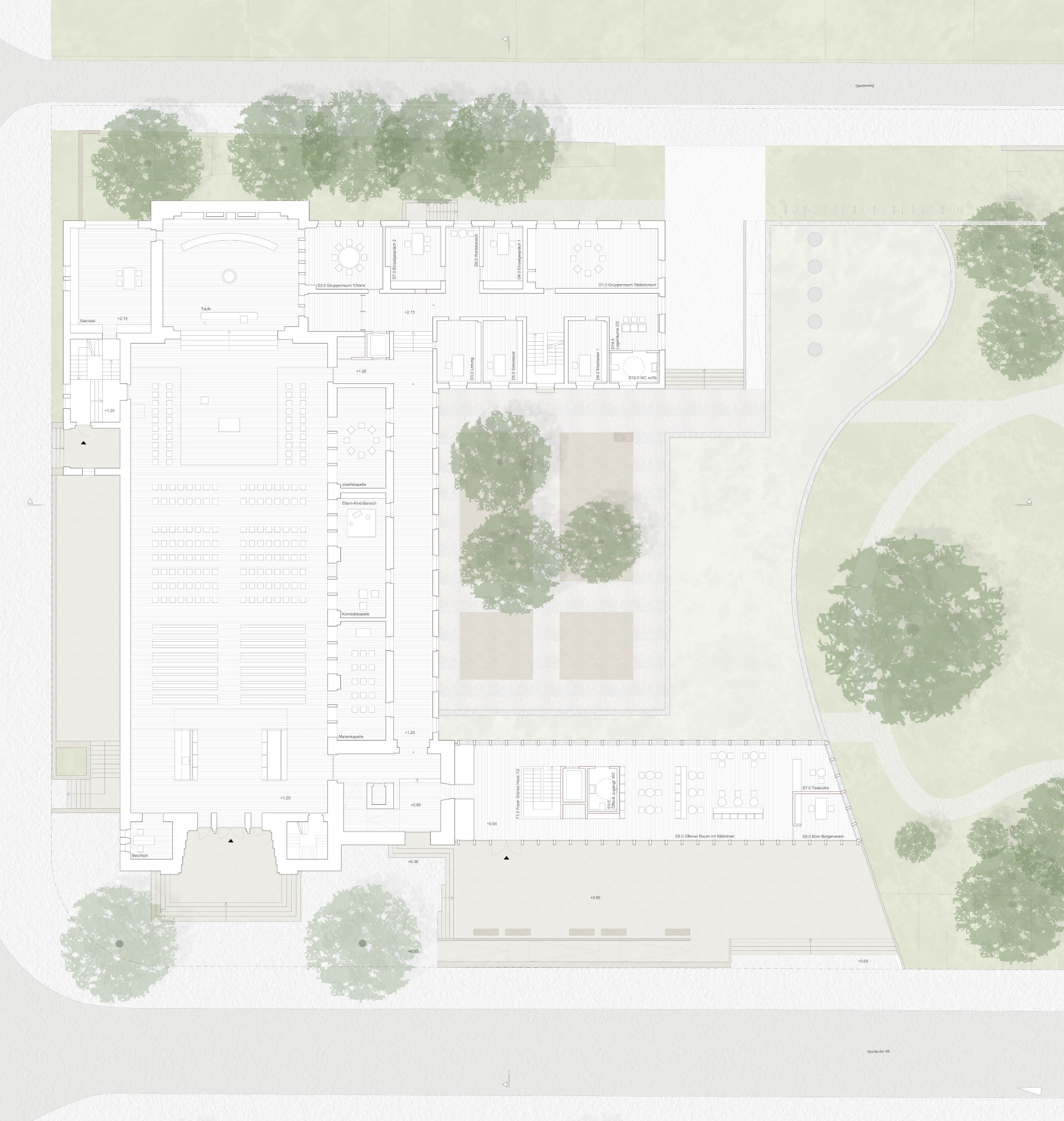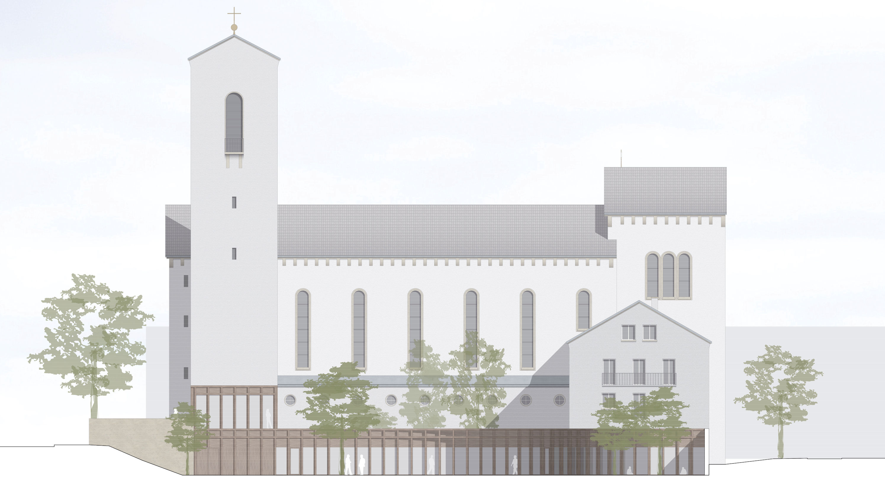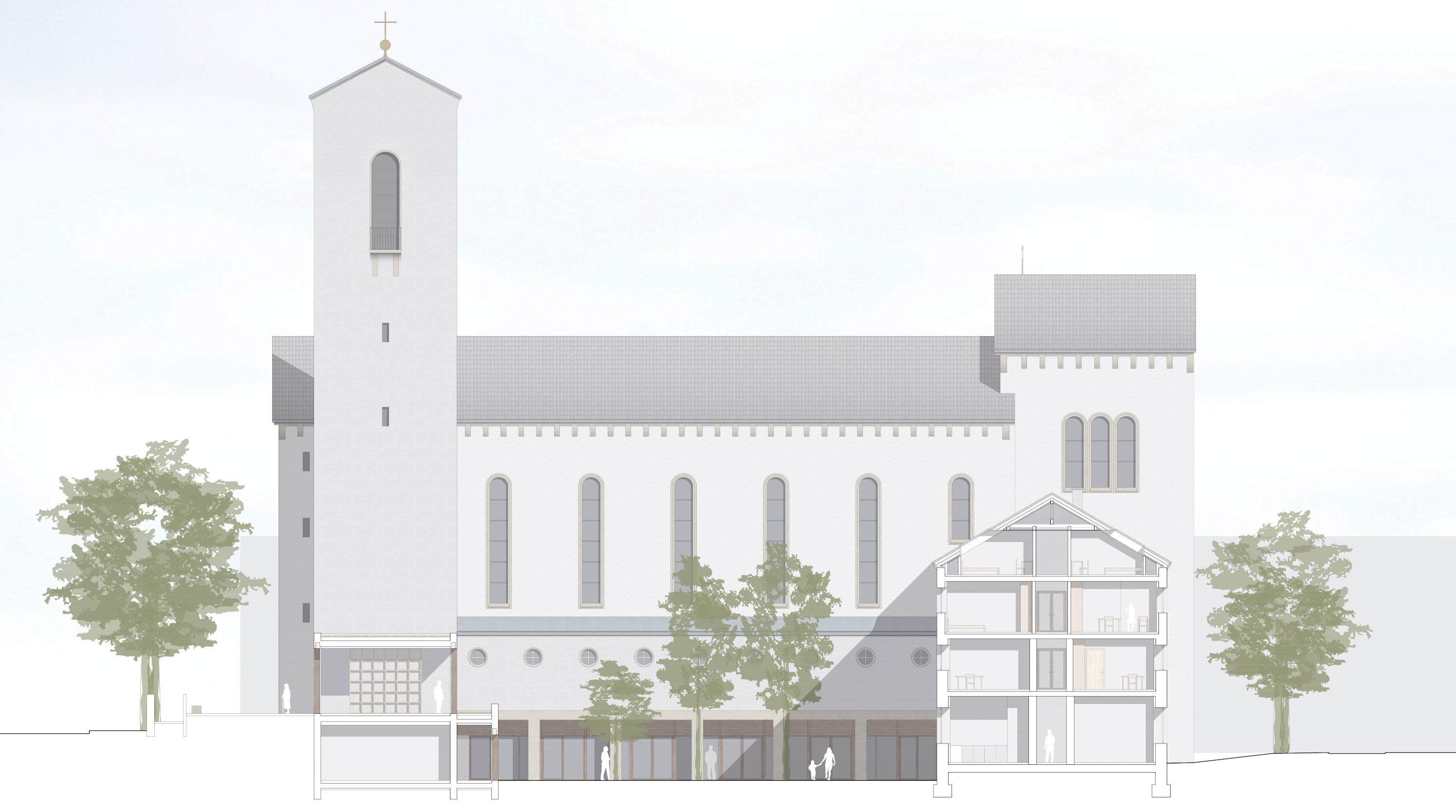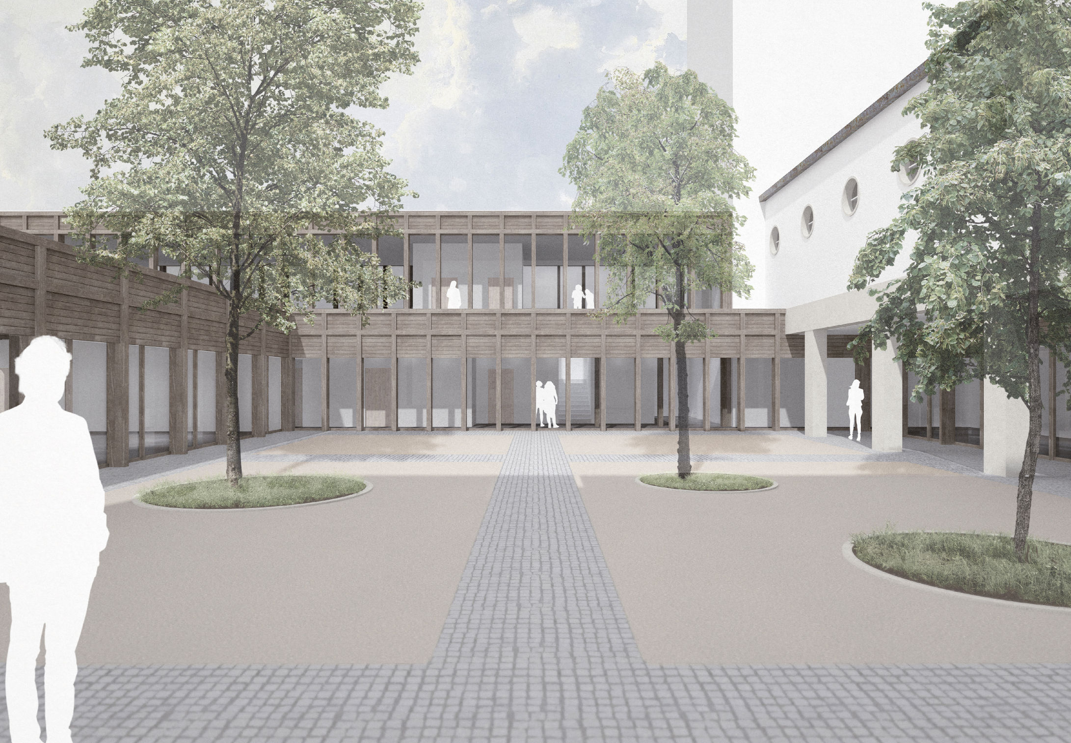 Der Entwurf sieht vor, das bestehende Ensemble aus den 1930er Jahren zu einem Stadtkloster zu erweitern. Der Klosterhof wird von der ergänzten Bebauung umschlossen, die entlang der Straße als offene Pavillonstruktur in Erscheinung tritt, die den Gebäudebestand deutlich ablesbar als hölzernes Möbel ergänzt. Über einen vorgelagerten Sockel erreicht man den neuen Hauptzugang, der eine eindeutige Adresse bildet. Das Dach schließt an den Kirchturm an, um einen unmittelbaren Zugang zum Kirchenraum und in das ehemalige Klostergebäude zu ermöglichen. Im Inneren hält die Struktur ansonsten Abstand zur Turmwand, die dadurch weiterhin erlebbar bleibt.