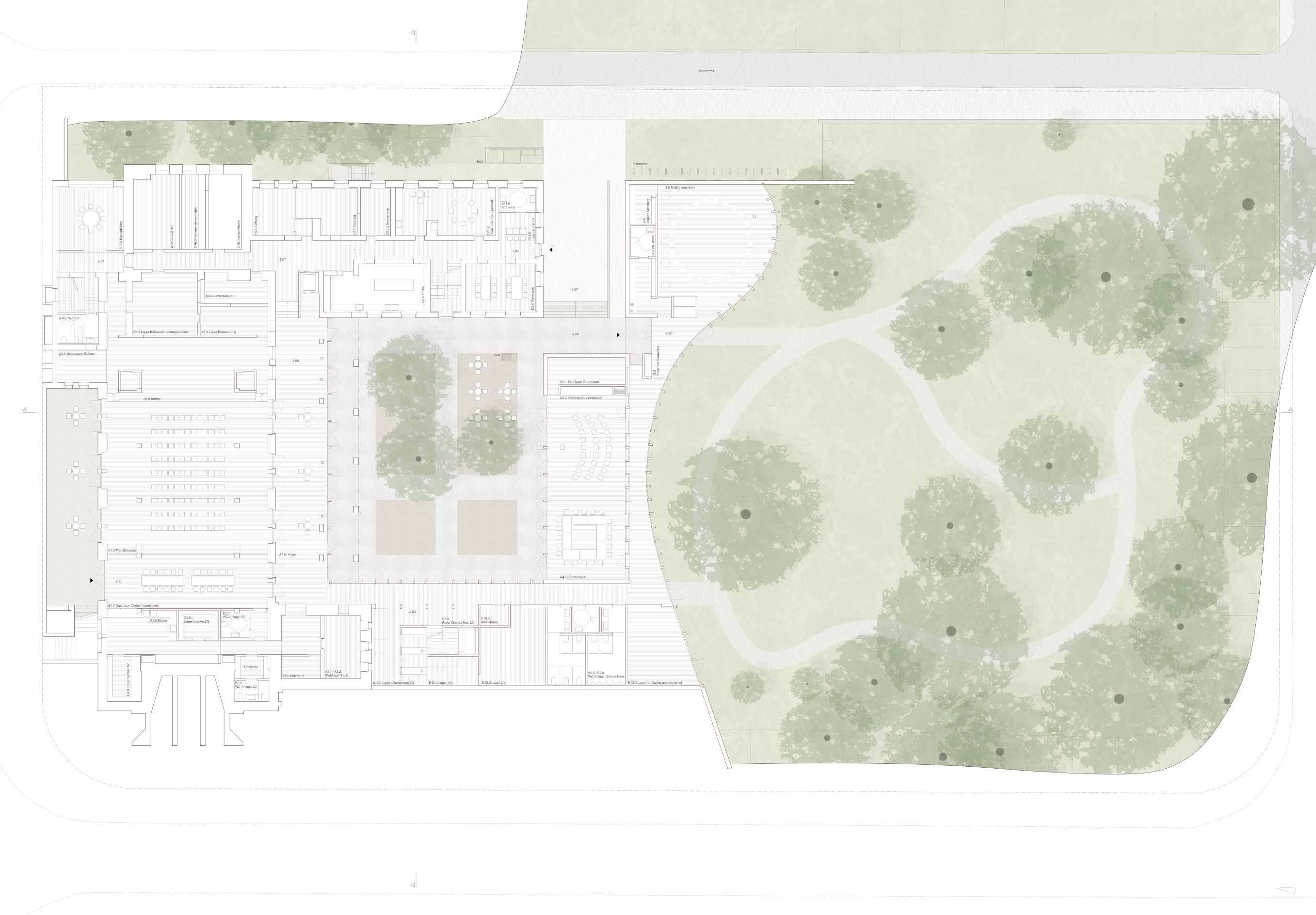 Der Klostergarten wird als Gegenüber zum Klosterhof verstanden und ist von diesem durch die beiden Gartensäle getrennt. Der orthogonalen Geometrie der um den Klosterhof angeordneten Bebauung wird mit dem Garten die Welt des organisch Gewachsenen gegenübergestellt, der orthogonalen Ordnung enthoben und als offener Landschaftsgarten gestaltet. Die neue Bebauung reagiert mit einer organisch geschwungenen Fassade auf diese andere Gestalt. Ihre Holzstruktur, betont transparent und offen, gibt damit auch ein neues Signal nach außen.