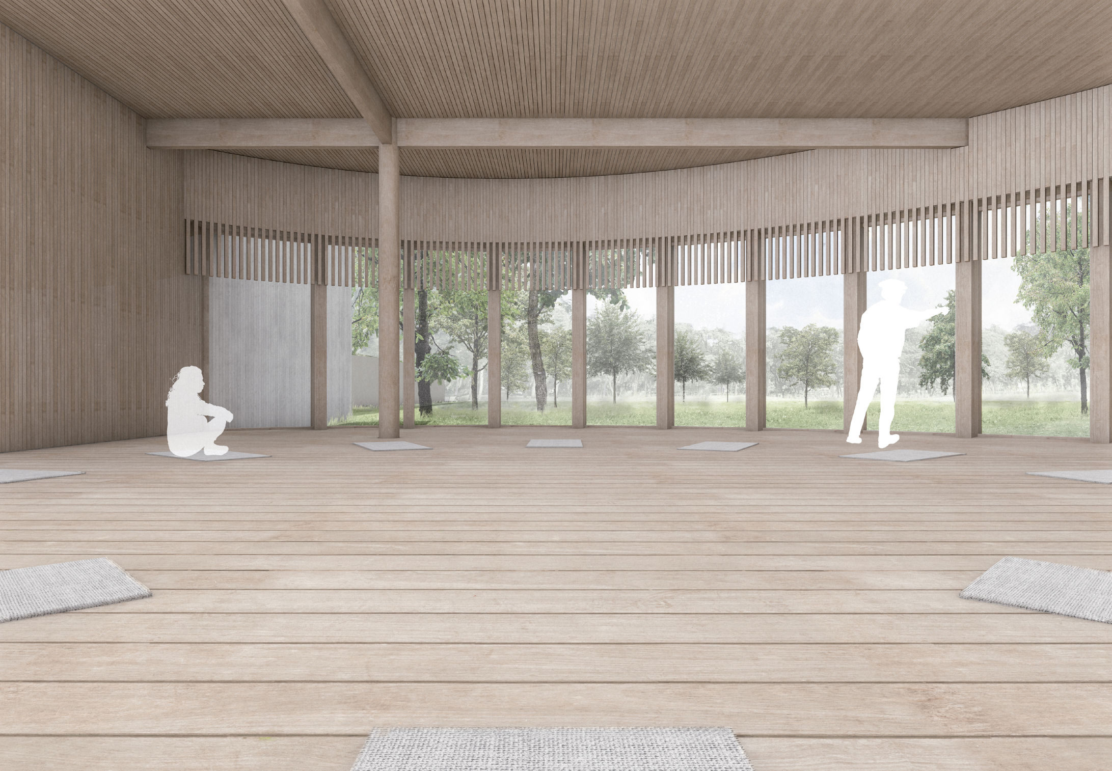 Der Charakter des nach Süden zum Garten ausgerichteten Meditationsraums wird durch die Holz-Glasfassade und den Blick in die Weite des Gartens geprägt. Eine runde Holzstütze im Quadratpunkt des Innenraums bildet gegenüber dem Blick in die Weite einen inneren Fixpunkt. T-förmig geführte Holzbalken verbinden sie mit der Decke und geben dem Raum über die Tragstruktur eine innere Ordnung.